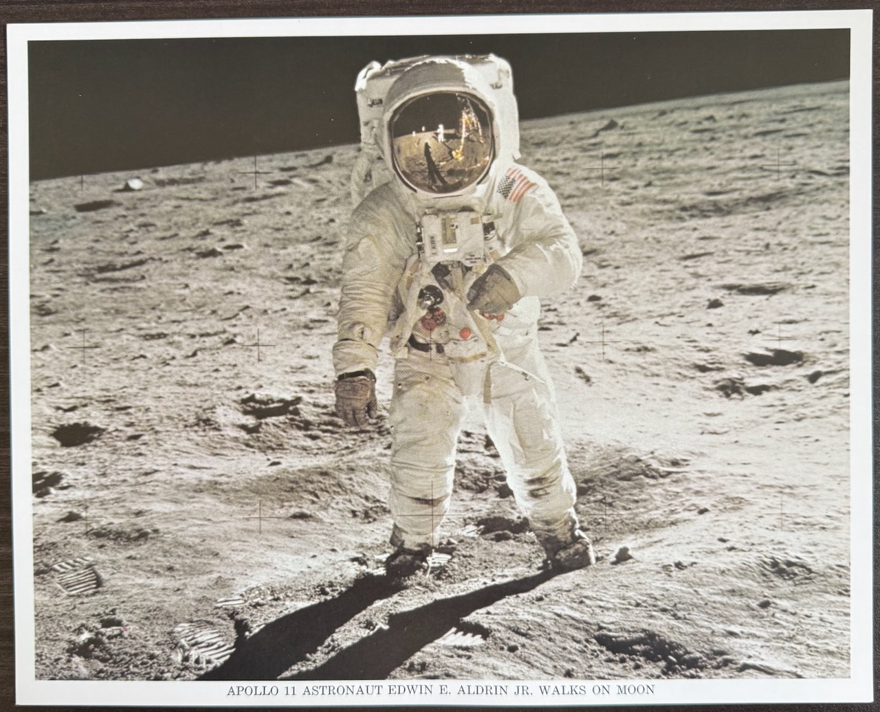 Vintage 8″ x 10″ NASA Apollo 11 litho of Buzz Aldrin in what has become known as the “Man on the Moon” photo, which famously has Neil Armstrong reflected in his gold visor.