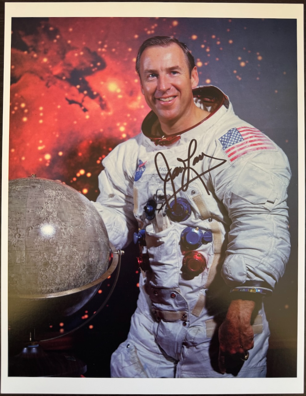 White Space Suit photo hand-signed with a black sharpie by NASA Astronaut and Apollo 13 commander James Lovell.